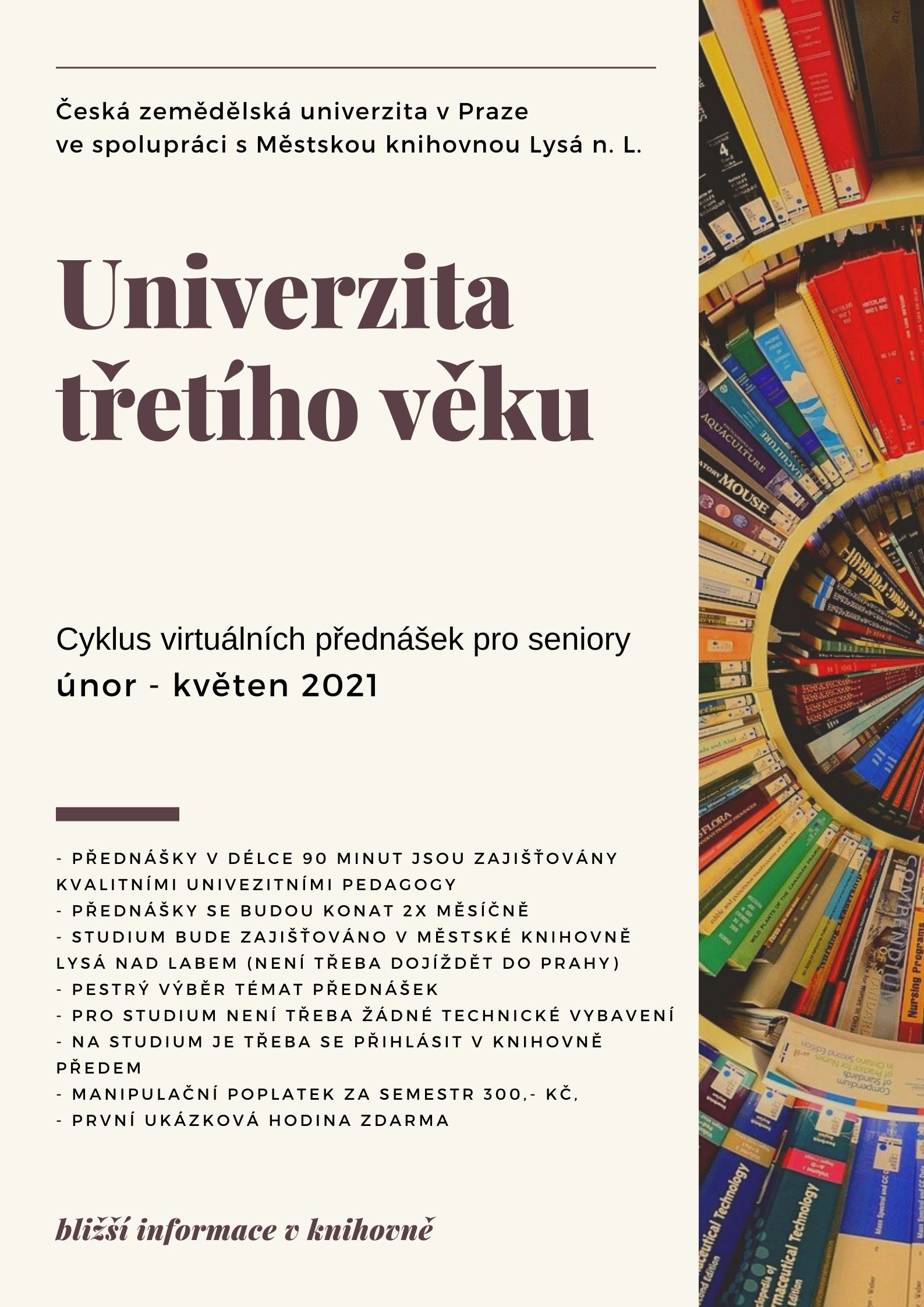 Nezařazené Virtuální přednášky U3V 8.1.20218.1.2021 redaktor Česká zemědělská univezita v Praze, přednáška, U3V, virtuální přednáška UNIVERZITA TŘETÍHO VĚKU ÚNOR – ČERVEN 2021 (přesné termíny a forma se dolaďují) cyklus virtuálních přednášek pořádaných ve spolupráci s Českou zemědělskou univerzitou v Praze Na cyklus je nutné se přihlásit v knihovně předem!